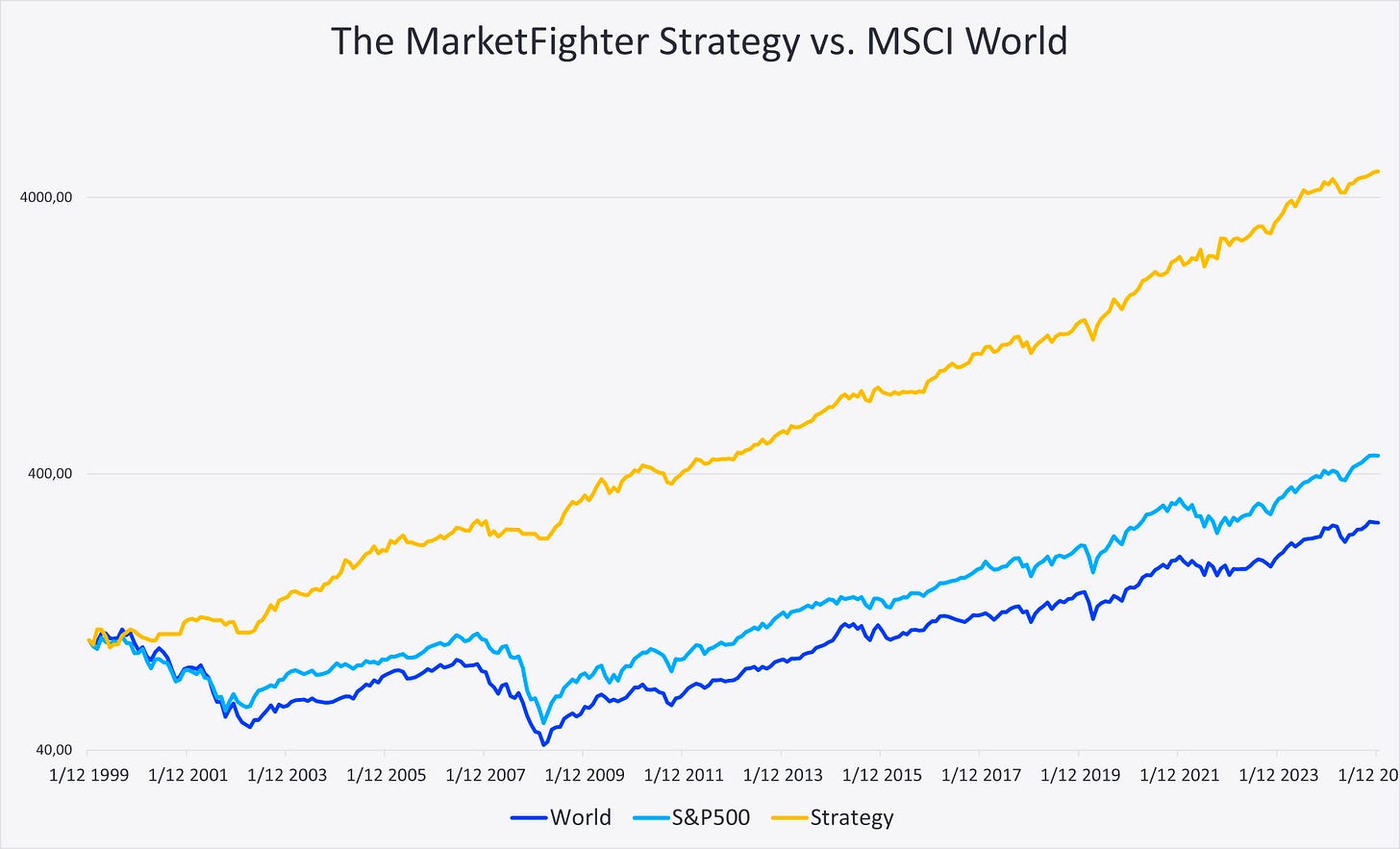 Notice the y-axis in this chart. Notice the nice linearity of the yellow line, representing the robustness and consistency of the combined strategy, which is remarkable compared to both the MSCI World Index and the S&P 500.