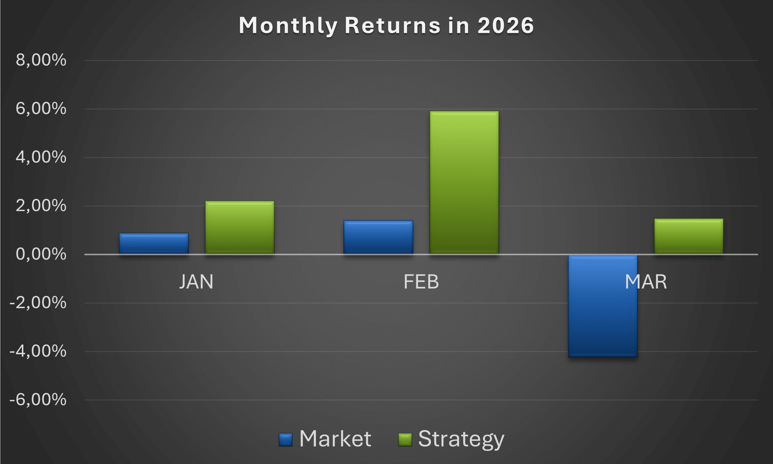 While global stock markets tumbled due to the war in Iran and the staggering oil price, followers of the MarketFighter Strategy experienced another month in green territory. Here is our monthly performance so far in 2026 compared to our market benchmark, the MSCI World Index: