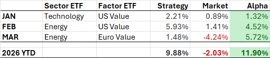 Since the strategy moved out of Technology and into the Energy sector on February 1st, it has delivered staggering returns. No one could predict the war or the recent development in the oil price, but the system detected a high relative momentum in the Energy sector at the end of January — long before the headlines caught up.