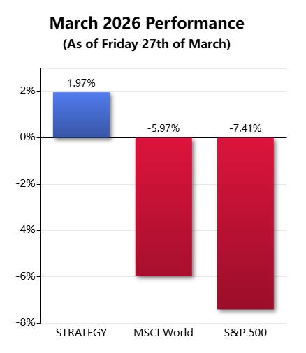 For subscribers who followed along and traded the March signal, this month was a joy. I will put up a full performance report for March during the coming week, but I can already say it has been a pleasure to watch our strategy stay in green while the rest of the market has been in turmoil. I posted this little chart a few days ago: